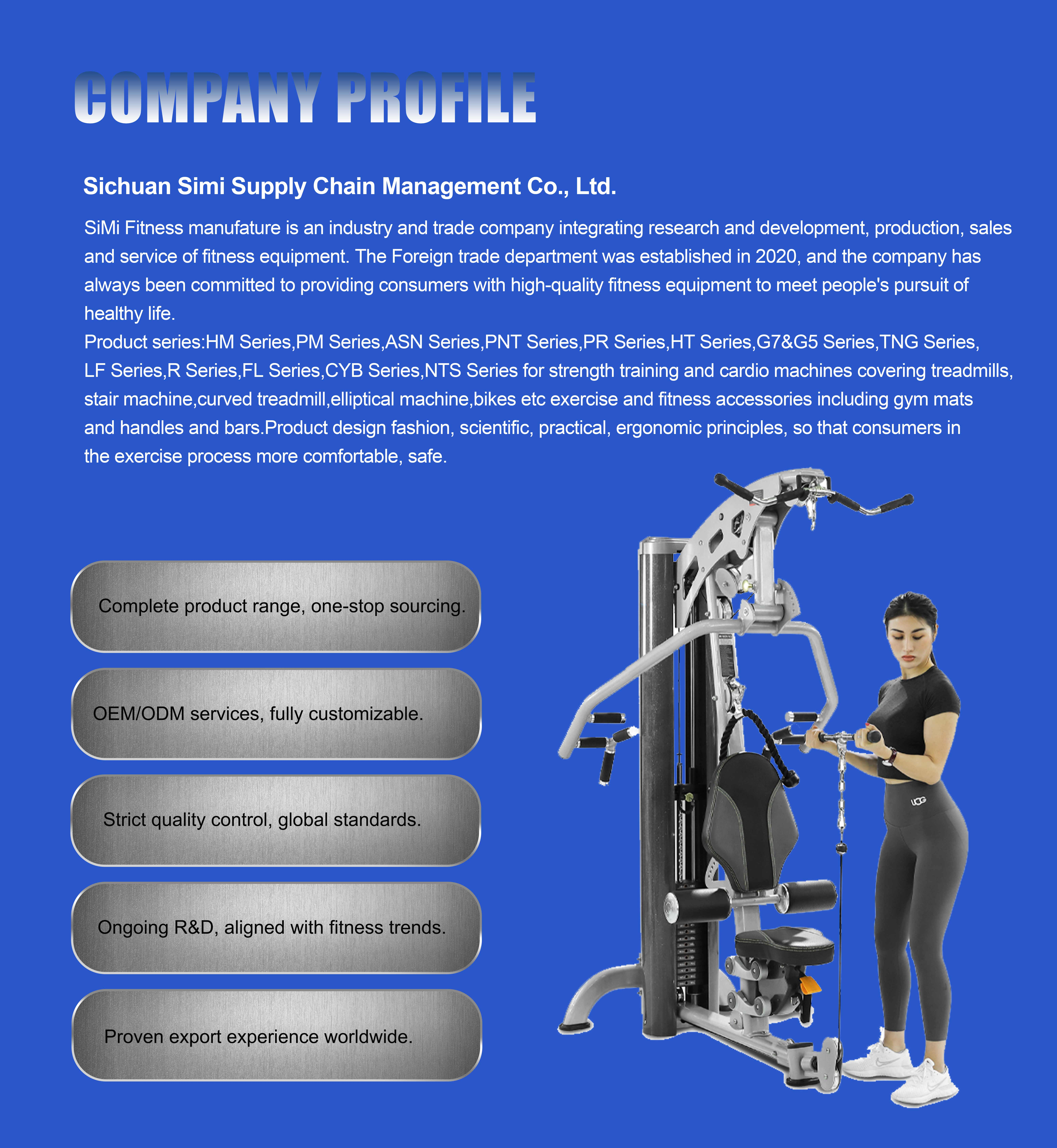Productos principales:Equipo de fitness, máquina cargada con placa, máquina cargada con PIN, máquina de cardio, máquina de cable